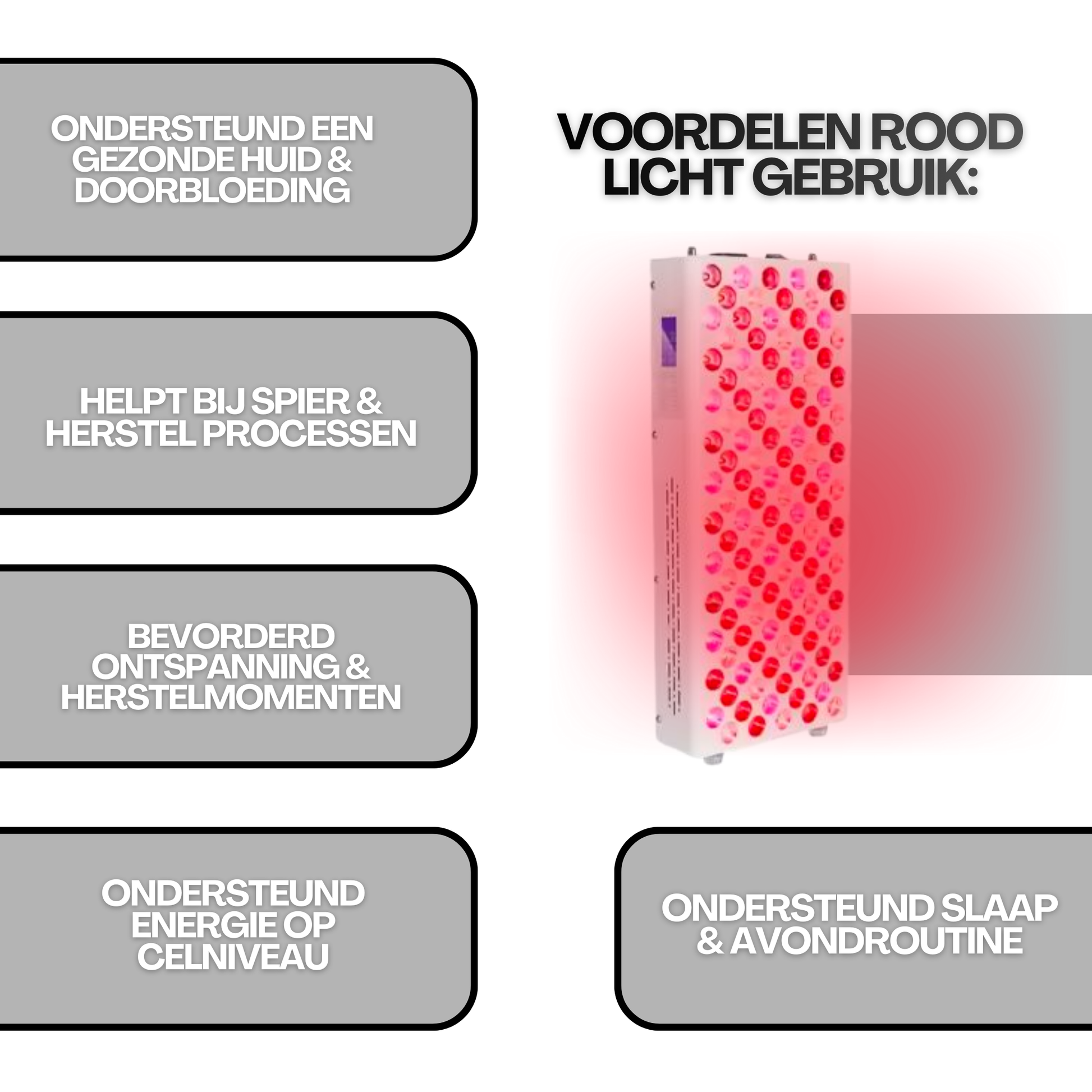 Door het stevige ontwerp, de verstelbare ophanging en de mogelijkheid om sessies nauwkeurig in te stellen, is dit paneel ideaal voor sporters, wellnessgebruikers en iedereen die rood licht structureel wil inzetten als onderdeel van zijn leefstijl.